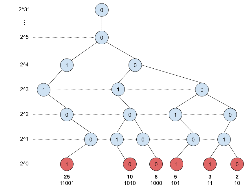 之后联想Trie tree和Binary之间的关系,可以画出上面这个图。这样问题就被转换为了找到最高的具有1节点的父节点,然后向下尽量找a^b = 1的分支 (我感觉我没有说清楚。。。)